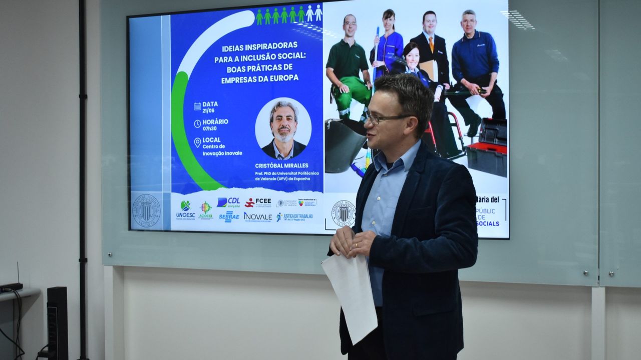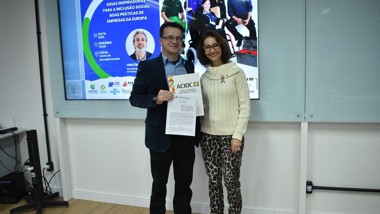 A ACIOC, em parceria com a Unoesc, promoveu na sexta-feira (21) o evento “Ideias Inspiradoras para a Inclusão Social: Boas Práticas de Empresas da Europa”. A palestra foi ministrada pelo professor Cristóbal Miralles, PhD, da Universitat Politècnica de Valencia (UPV), Espanha. Na oportunidade, a associação também assinou termos de cooperação com a Justiça de Trabalho de Joaçaba, fomentando a participação nos programas “Trabalho Seguro – PTSe” e “Programa de Combate ao Trabalho Infantil e estímulo à aprendizagem”. O evento foi realizado no Polo de Inovação Inovale e contou com a presença de representantes da Universidade, de entidades de classe e empresários.