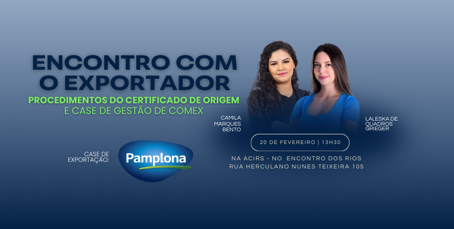 Durante o evento serão abordados os procedimentos do certificado de origem e, também, a empresa Pamplona Alimentos apresentará o case de exportação utilizando a gestão de COMEX.