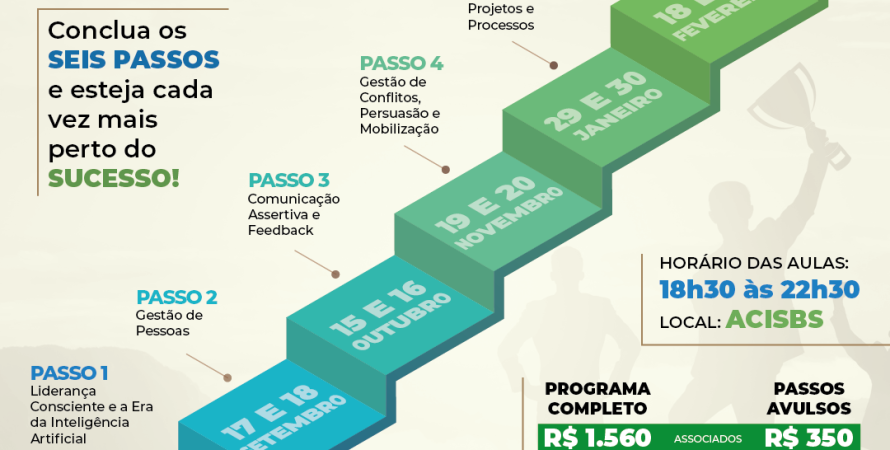 Os participantes irão aprender estratégias e competências essenciais para liderar equipes de forma eficaz em ambientes de negócios dinâmicos e competitivos, com uma abordagem focada na produtividade e agilidade. O primeiro passo (como chamamos os módulos desse curso) está marcado para os dias 20 e 21 de agosto, das 18h30 às 22h30, presencialmente na Acisbs. Os demais passos e datas você confere abaixo.